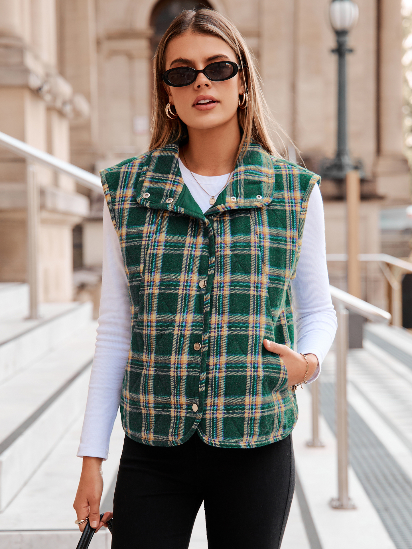 This lightweight puffer vest combines warmth and style with its sleek sleeveless silhouette and button-down front. Crafted from soft, wind-resistant fabric with cozy padding, it keeps you comfortable in chilly weather. Functional side pockets add practicality, perfect for layering over sweaters or shirts for casual outings, travel, or daily wear.