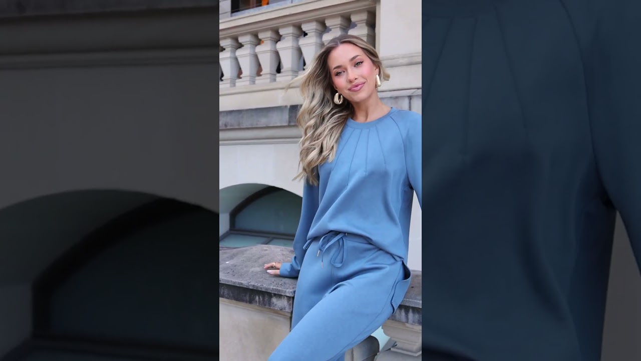 Cozy two piece lounge set with soft, comfortable fabric, pleated sweatshirt, and wide leg pants. Perfect for airport travel, casual days, or relaxing in style.